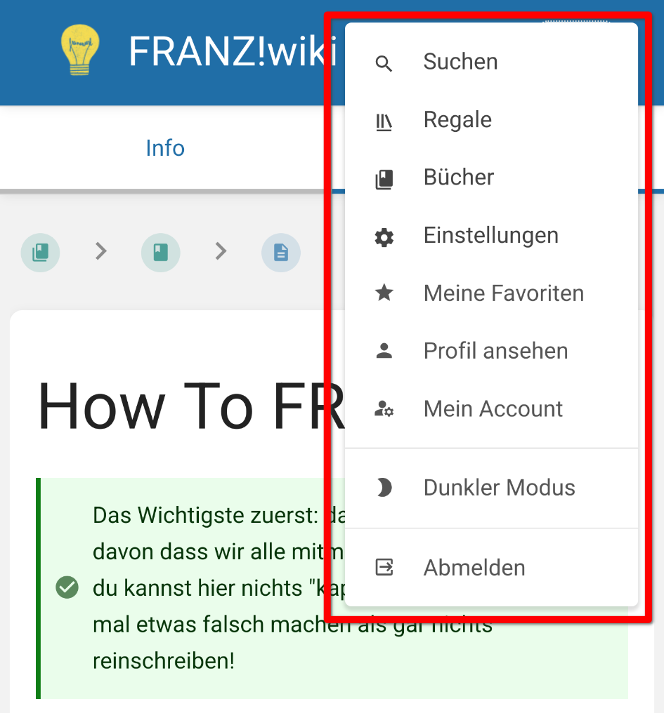 Das Wiki sieht auf dem Handy genauso aus wie auf dem Computer. Wenn du das Wiki allerdings auf dem Handy editieren möchtest, dann ist die Interaktion aus Design-Gründen teilweise anders als in den folgenden Screenshots dargestellt. Aus Gründen empfehlen wir die Bearbeitung des Wikis auf dem Computer. Möchtest du aber das Wiki im Handy editieren dann schaue dir für einen leichteren Einstieg am besten die Erläuterungen zur Darstellung auf dem Handy am Ende dieser Seite an.